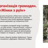Окрема увага була приділена ролі жінок у повоєнний період так званим Trümmerfrauen («жінкам із руїн»), які взяли на себе основний тягар відновлення міст, часто без оплати. Ці жінки стали символом стійкості, відповідальності та відродження.
